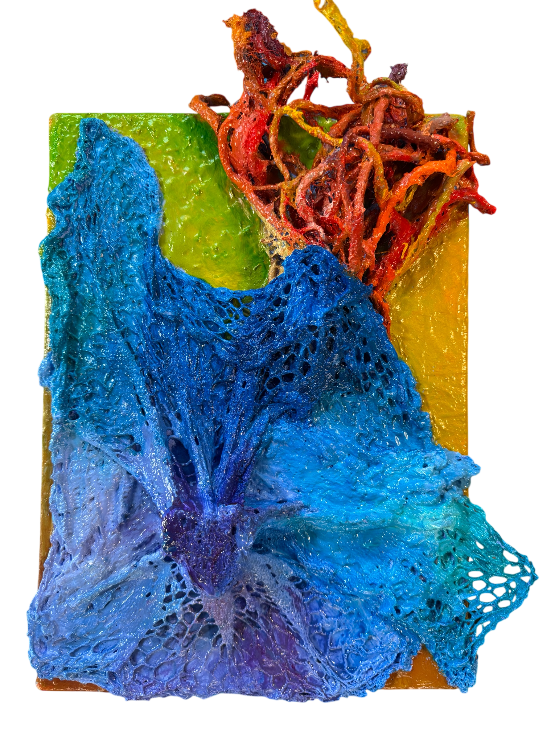Squid Escape est un tableau peint à l’huile sur toile en lin 33×25 cm, napperon et filet. Dimensions finales 40×28 cm. Réalisé par Crann Piorr’Art en 2025
