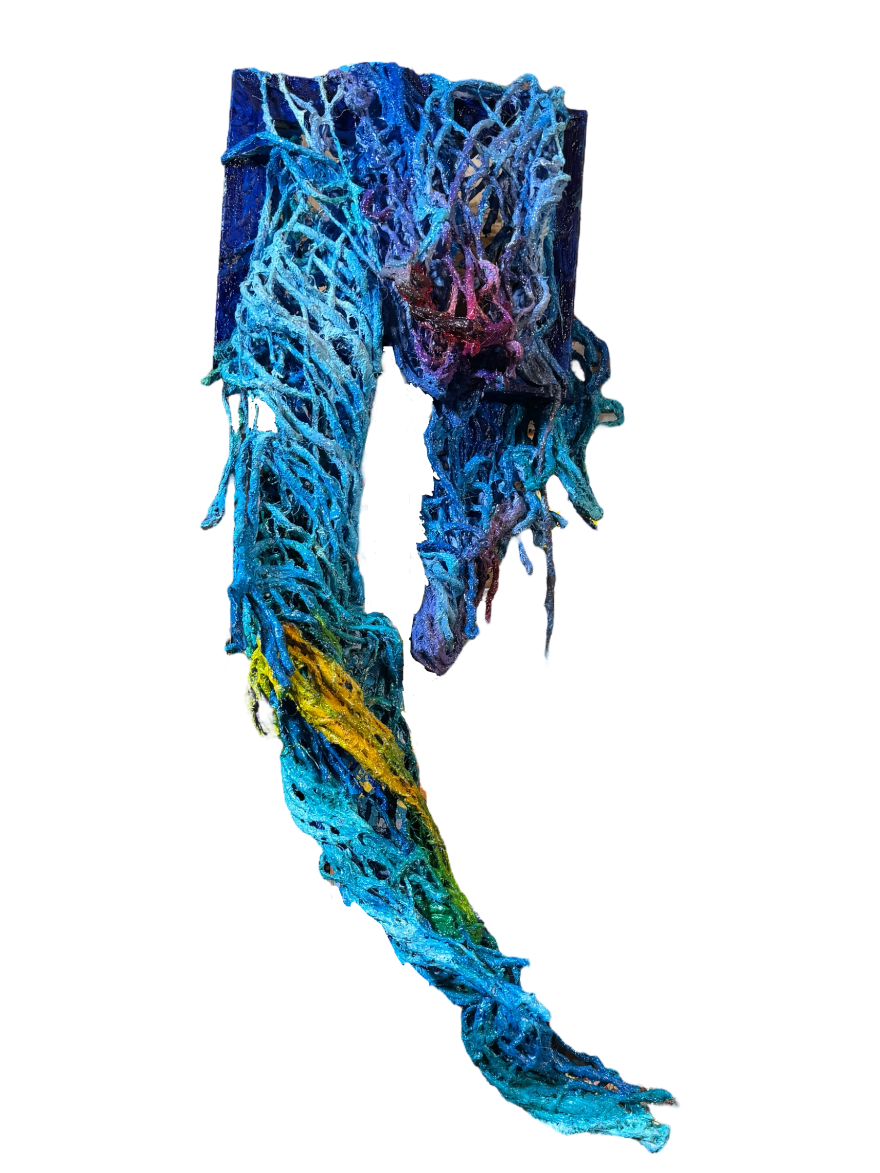 The Gloss Goes Off est une création textile de l’artiste Crann Piorr’Art réalisée à partir d’un filet en jute à grosses mailles monté autour d’un châssis de 20×30 cm et largement débordant pour atteindre une taille finale de 75×33 cm. Réalisé en 2025.