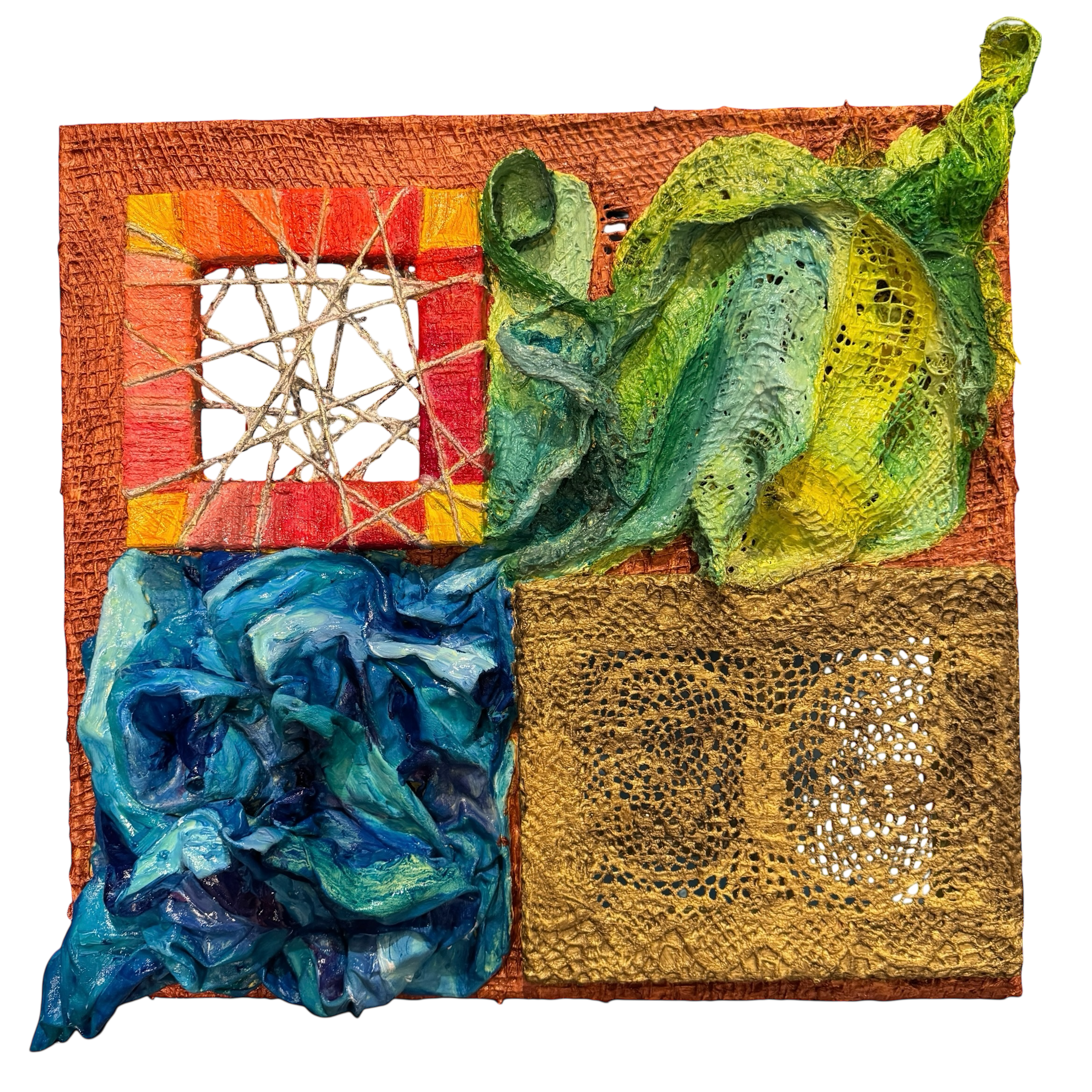 Windows est un tableau peint à l’huile sur filet monté sur châssis 51×55 cm, tissus, filets, napperon monté sur petit châssis et ficelle montée sur un autre petit châssis. La taille totale 60×60 cm car le tableau sort du cadre sur une diagonale. Réalisé en 2025 par l’artiste Crann Piorr’Art