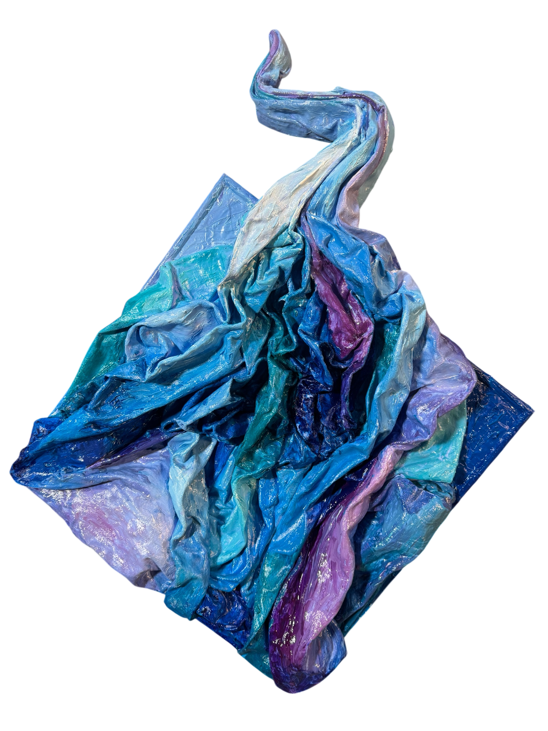 Huile sur toile en lin 80x80 cm avec ajout de filet, tricot, tissu en coton drapé, bouchons de liège @Crann Piorr'Art 2024